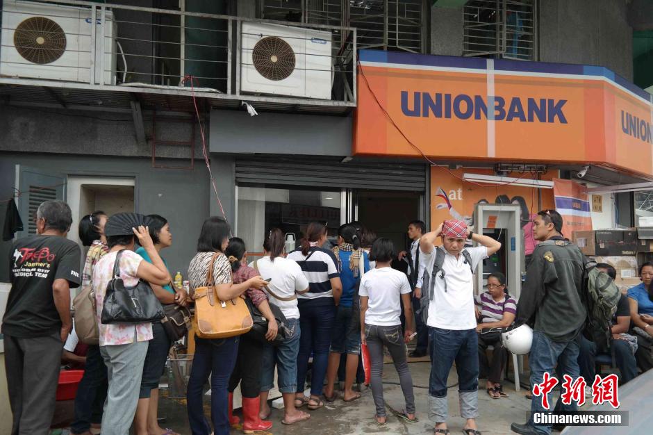 11月29日,菲律宾台风重灾区塔克洛班市居民在一家银行前排队等待办理业务。11月8日,超强台风“海燕”袭击菲律宾中部地区,塔克洛班市受灾尤其严重,当地各家银行在灾后曾停业多日。中新社发 张明 摄