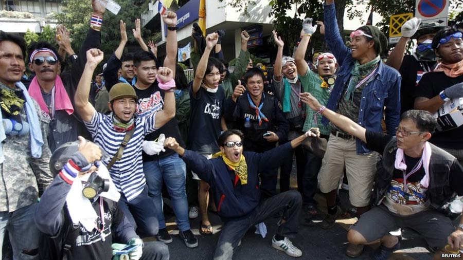 示威者挥舞着泰国国旗,吹着哨子,有人坐在总理府的草坪上,还有人摆姿势拍照,现场充满狂欢气氛。(来源:路透社)