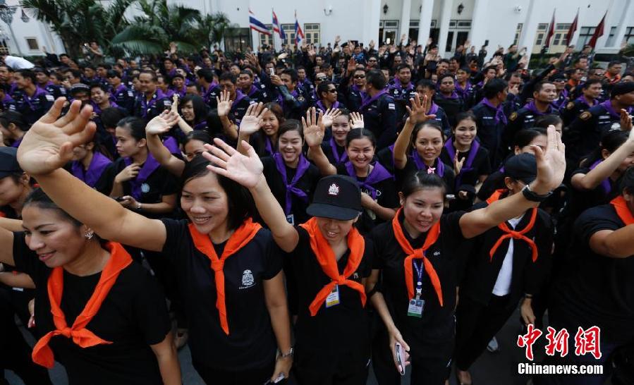 当地时间12月4日,泰国曼谷,女警们列队招手欢送离开警察总部的示威者们。