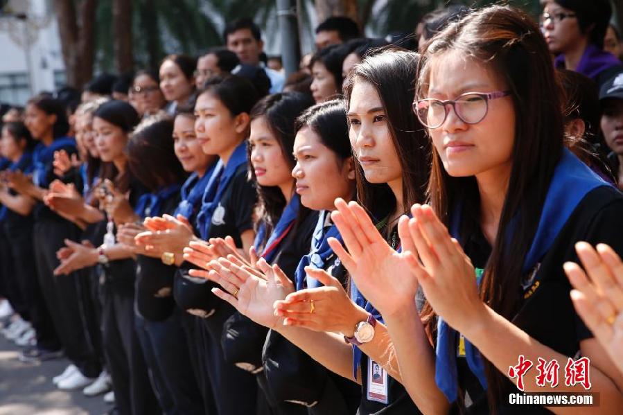 当地时间12月4日,泰国曼谷,女警们列队拍手欢送离开警察总部的示威者们。
