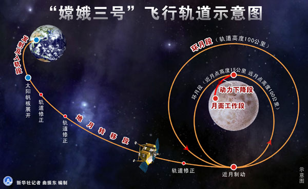 新华网北京12月6日电(记者田兆运、赵薇)北京时间12月6日17时53分,北京航天飞行控制中心对嫦娥三号探测器成功实施近月制动,嫦娥三号探测器顺利进入环月轨道。
