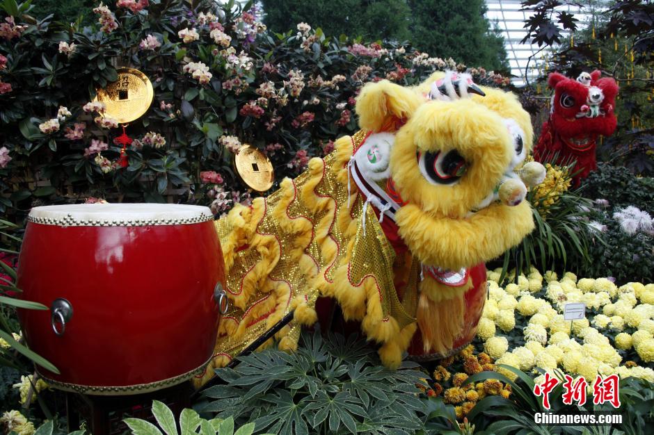 2月12日,马年正月十三,新加坡街头巷尾特别是华人居住区域,马年春节元素仍随处可见。图为植物园内一处花坛中,大鼓、钱币相伴黄、红两狮,寓意吉祥。孙自法 摄