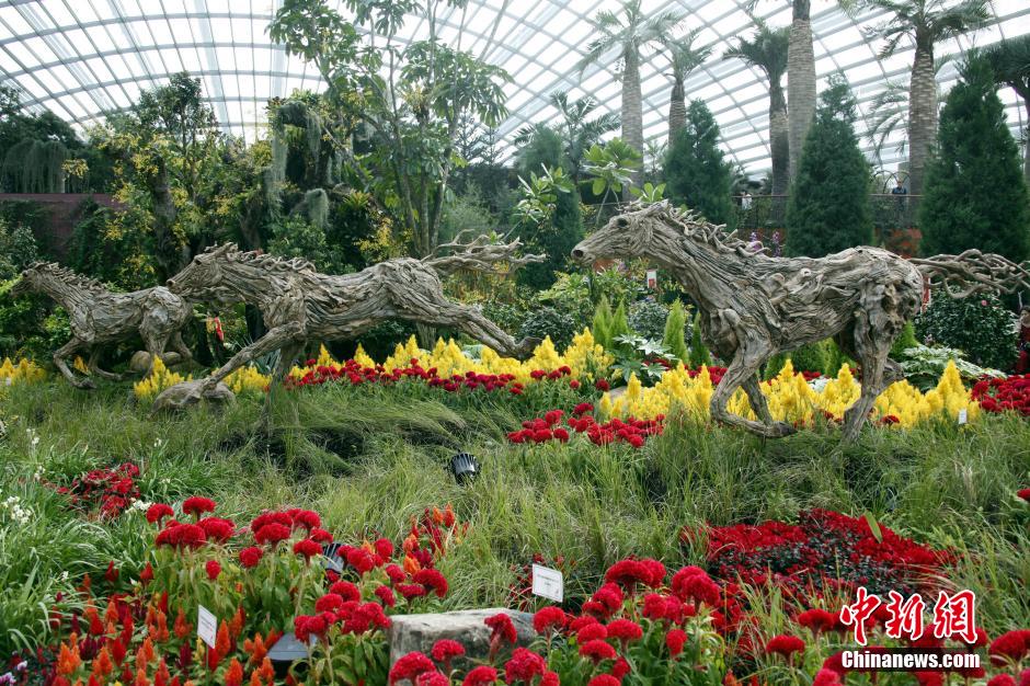 2月12日,马年正月十三,新加坡街头巷尾特别是华人居住区域,马年春节元素仍随处可见。图为植物园内一处花坛中的马踏鲜花向前飞奔造型,构思奇特。孙自法 摄