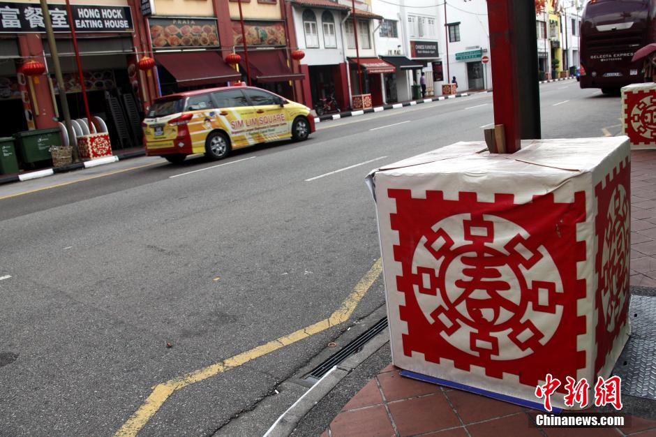 2月12日,马年正月十三,新加坡街头巷尾特别是华人居住区域,马年春节元素仍随处可见。图为市区一条街道两侧路灯灯柱底座以剪纸形式贴上春花,很有特色。孙自法 摄