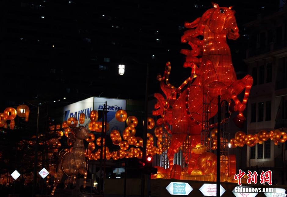 2月12日,马年正月十三,新加坡街头巷尾特别是华人居住区域,马年春节元素仍随处可见。图为市区一处街道入口以巨型马灯领衔,沿街马灯与铜钱灯饰连成一片,场面特别壮观,引人注目。孙自法 摄