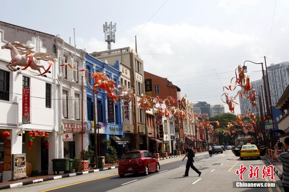2月12日,马年正月十三,新加坡街头巷尾特别是华人居住区域,马年春节元素仍随处可见。图为市区一条街道两侧高悬有“万马奔腾”的装饰,颇具气势。孙自法 摄