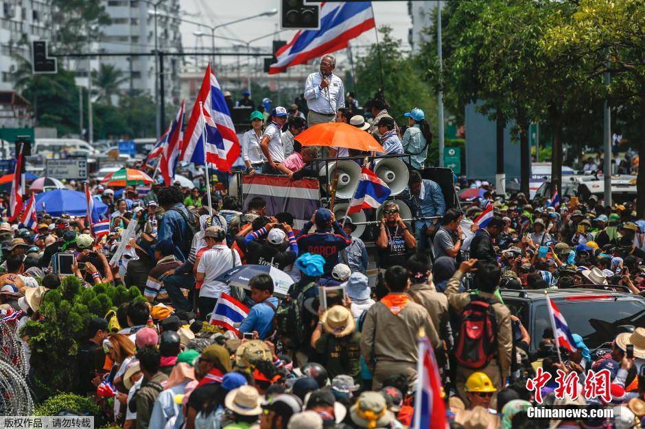 2月19日,泰国反政府示威者包围泰国总理英拉位于曼谷北部一处陆军部设施的临时办公室,并要求其辞职。图为泰国反政府领导人素贴在现场发表演讲。
