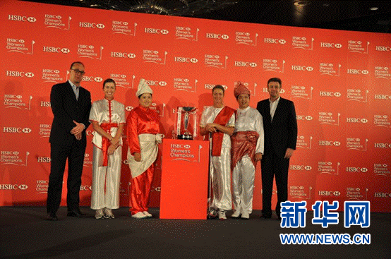 新华网新加坡频道2月25日电(实习记者陈丽婷)汇丰银行女子高尔夫锦标赛于2月25日举行记者招待会。四位世界顶级的女子高尔夫球手汇聚一堂,包括目前世界排名第一的韩国球手朴英碧(Inbee Park), 世界排名第二的挪威球手苏珊·彼特森(Suzann Pettersen),世界排名第六的中国球手冯珊珊以及世界排名第十一的美国球手保拉·克里默(Paula Creamer)穿着具有亚洲特色的女武士装束出席记者招待会。