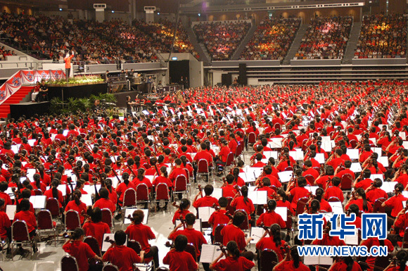 新华网新加坡频道(记者 符传威 左昊畅)新加坡华乐团将于6月28日在新落成的新加坡国家体育场举办的《全民共乐2014》超大型音乐会。这场以“我的家园-新加坡!”为主题的音乐会一共吸引到了4,919名演出成员,远远超越了原定4,000人的目标。其阵容包括3,745名演奏家和1,174名合唱团员。众人还将合力挑战多项新加坡纪录和吉尼斯世界纪录。