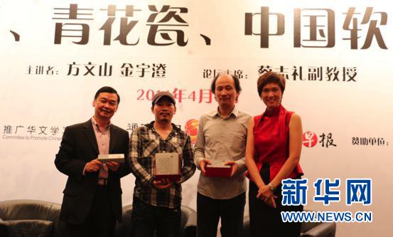 新华网新加坡频道4月8日电(记者 左昊畅 摄影 符传威)由新加坡推广华文学习委员会和通商中国主办的透视中国系列讲座暨文学四月天公开论坛于6日开讲。今年活动主办方邀请到华语流行音乐歌词创作人方文山、中国著名作家金宇澄担任演讲嘉宾,围绕两人各自的代表作《青花瓷》与《繁花》,谈华语创作中凸显出的中国软实力的丰富内涵。