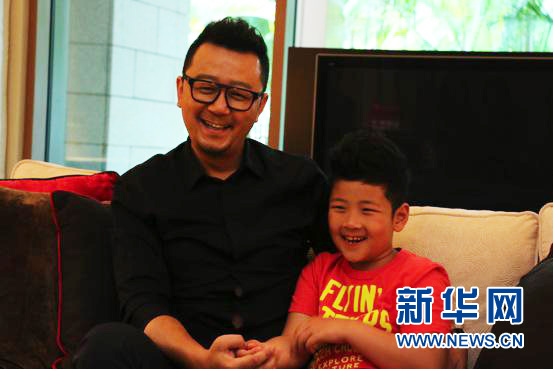 图为郭涛和儿子石头接受新华网新加坡频道记者采访