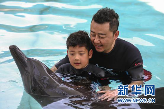 图为郭涛父子在新加坡海洋馆与海豚互动(图片供稿 新加坡圣淘沙名胜世界)
