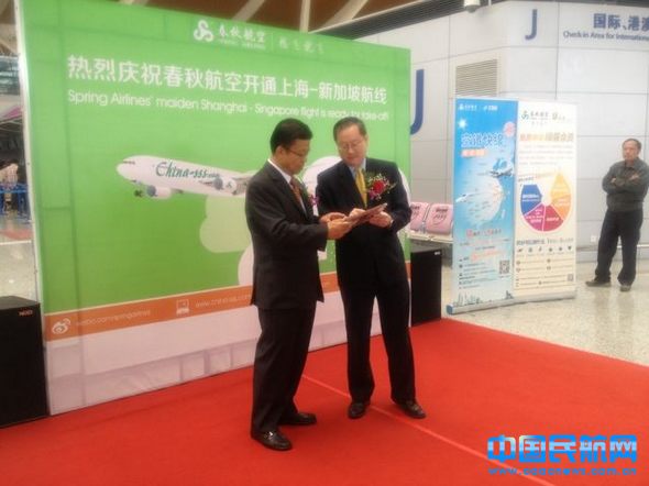 春秋党委书记与新加坡驻沪总领事互赠礼物。首航旗帜打开。