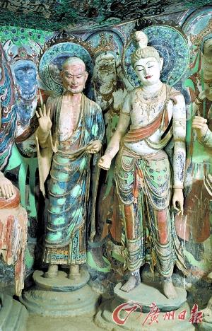 甘肃敦煌,在汉唐时期是丝绸之路上的枢纽重镇。作为中西方文化汇合点的敦煌,境内有四大石窟之一的莫高窟,虽经飞沙走石、历代劫难,却仍难掩这一世界文化遗产的千年风光,这是世界上现存规模最宏大、保存最完好的佛教艺术宝库,作家冯骥才称之为“一部放在沙漠上壮丽无比的佛学图典”;而古丝路东段重镇天水(旧称秦州)境内的麦积山石窟,则在小陇山的秀峰环抱之中,长年湿润,因雕塑林立而被历史学家范文澜誉为“陈列塑像的大展览馆”。