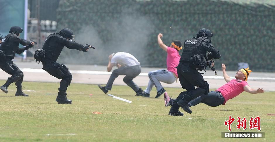 5月27日,浙江省公安机关“特警三号”反恐维稳汇报演练在绍兴市举行。来自浙江省各地市千余名公安特警、武警、海警、警卫部队和消防等反恐一线的队伍进行了暴力恐怖事件实战处置、武警反恐特战演练、高精度狙击步枪射击和群体性事件处置等9个科目的演练。这次演练皆在检验浙江公安机关对反恐斗争的快速反应的实战能力。图为暴力恐怖事件实战处置。中新社发 袁云 摄