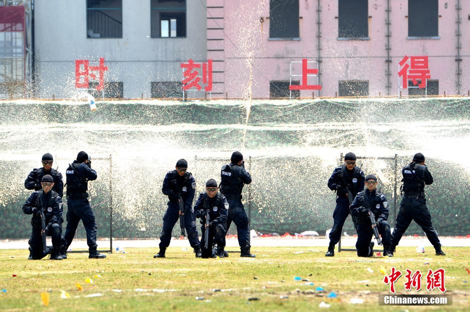 5月27日,浙江省公安特警队开展反恐演练,来自浙江省各地市千余名公安特警、武警、海警、警卫部队和消防等反恐一线的队伍进行了暴力恐怖事件实战处置、武警反恐特战演练、高精度狙击步枪射击和群体性事件处置等9个科目的演练。中新社发 周尔博 摄