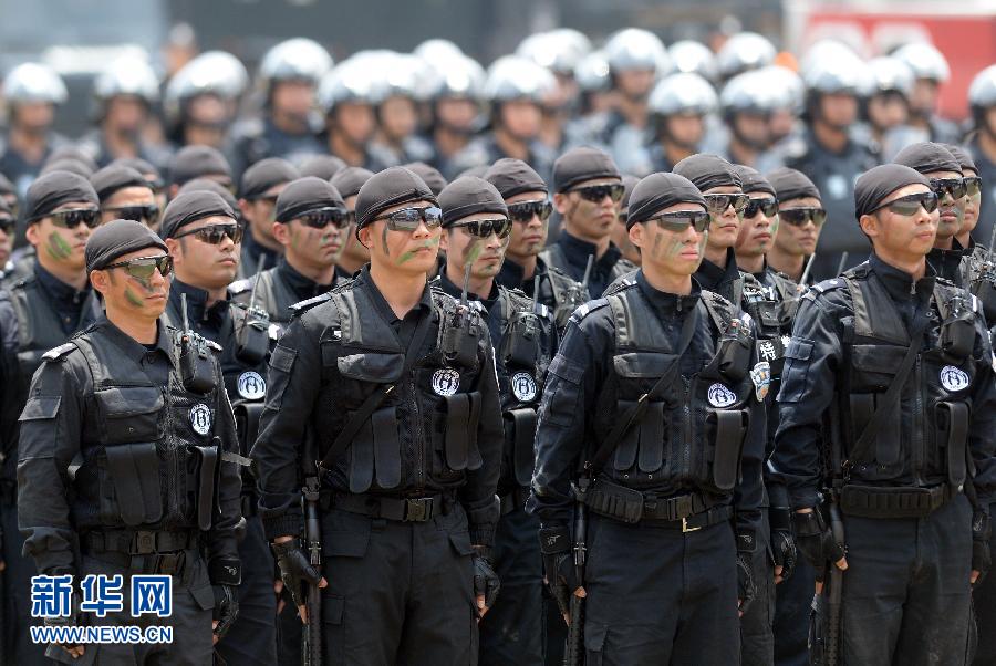 5月27日,参加反恐演练的杭州特警整装待发。当日,来自浙江省各地公安机关的武警、特警、海警、消防、警卫等部门的近千名反恐精英来到浙江省绍兴市,举行浙江省公安机关“特警3号”反恐维稳汇报演练,参演人员表演了包括擒敌技能战术、男女长短枪应用设计、要人警卫、武警反恐特战演练、暴力恐怖事件实战处置等9个演练课目,并展示了10大类、88项反恐维稳装备及车辆。来自浙江省各反恐成员单位、沪苏皖公安系统代表及媒体代表观摩了此次演练。新华社记者 王定昶摄