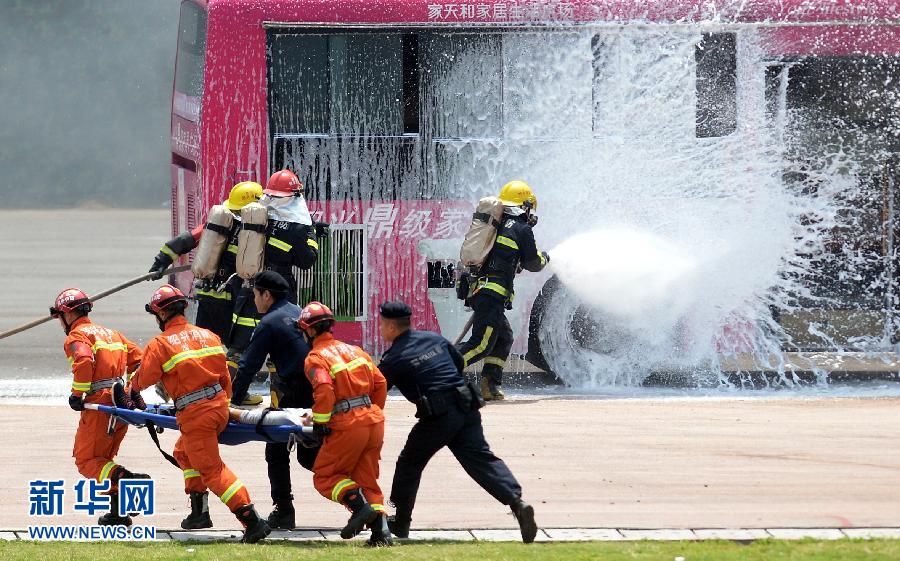 5月27日,参加反恐演练的消防人员在给发生“爆炸”的车辆灭火,并抢救受伤人员。当日,来自浙江省各地公安机关的武警、特警、海警、消防、警卫等部门的近千名反恐精英来到浙江省绍兴市,举行浙江省公安机关“特警3号”反恐维稳汇报演练,参演人员表演了包括擒敌技能战术、男女长短枪应用设计、要人警卫、武警反恐特战演练、暴力恐怖事件实战处置等9个演练课目,并展示了10大类、88项反恐维稳装备及车辆。来自浙江省各反恐成员单位、沪苏皖公安系统代表及媒体代表观摩了此次演练。新华社记者 王定昶摄
