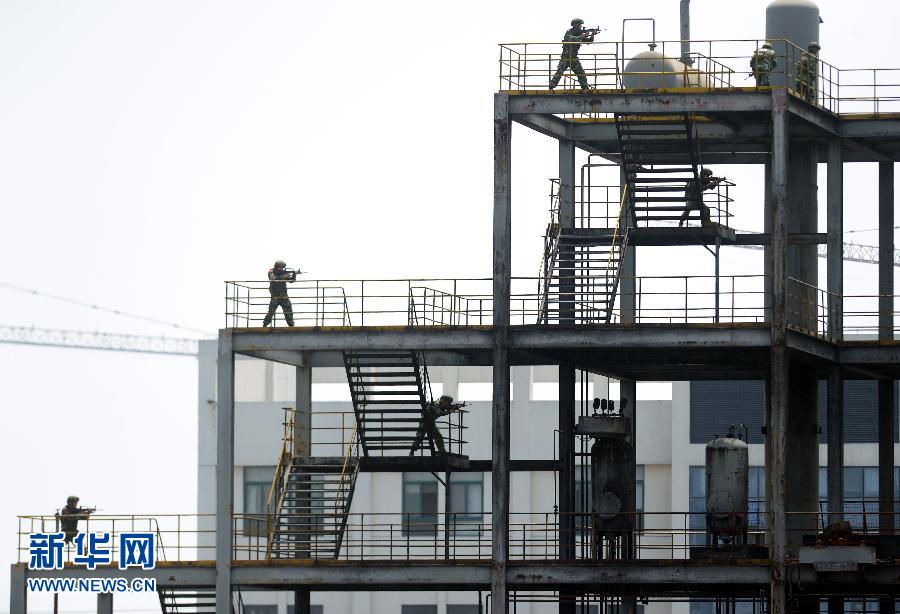 5月27日,参加反恐演练的特警在进入一幢建筑物搜寻“恐怖分子”。当日,来自浙江省各地公安机关的武警、特警、海警、消防、警卫等部门的近千名反恐精英来到浙江省绍兴市,举行浙江省公安机关“特警3号”反恐维稳汇报演练,参演人员表演了包括擒敌技能战术、男女长短枪应用设计、要人警卫、武警反恐特战演练、暴力恐怖事件实战处置等9个演练课目,并展示了10大类、88项反恐维稳装备及车辆。来自浙江省各反恐成员单位、沪苏皖公安系统代表及媒体代表观摩了此次演练。新华社记者 王定昶摄