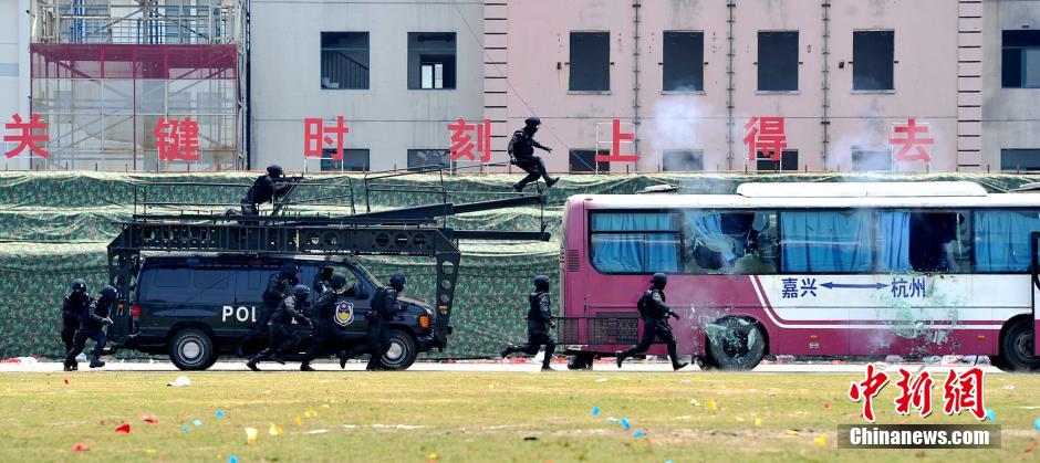 5月27日,浙江省公安特警队开展反恐演练,来自浙江省各地市千余名公安特警、武警、海警、警卫部队和消防等反恐一线的队伍进行了暴力恐怖事件实战处置、武警反恐特战演练、高精度狙击步枪射击和群体性事件处置等9个科目的演练。中新社发 周尔博 摄