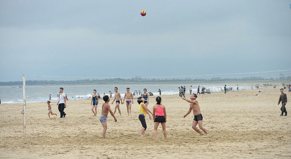 朝鲜民众在海边玩耍。(网页截图)