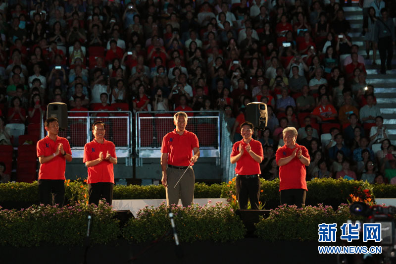 新华网新加坡频道6月29日电(记者左昊畅 实习记者陈丽婷)约3万狮城民众28日晚共聚新落成的新加坡体育城,共同欣赏由新加坡华乐团与127个表演团体(共计约5000名表演者)合作呈献的超大型华乐演出《全民共乐2014:我的家园– 新加坡!》。新加坡总理李显龙、文化、社区及青年部长兼通讯及新闻部第二部长黄循财出席并见证这一华乐盛会。新加坡总理李显龙挥动指挥棒,为《全民共乐2014》揭开序幕。
