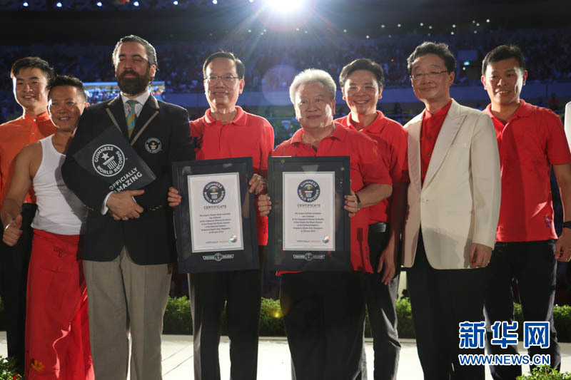 图为新加坡文化、社区及青年部部长/通讯及新闻部第二部长黄循财(右三)、新加坡华乐团董事局主席李国基(左四)、《全民共乐2014》筹委会主席吴一贤(右四)、新加坡华乐团总经理何伟山(右一)、《全民共乐2014》指挥葉聪(右二)、新加坡华乐团驻团指挥郭勇徳(左二)、新加坡华乐团驻团青年助理指挥倪恩辉(左一)与吉尼斯世界纪录裁判官(左三)共同庆贺《全民共乐2014》缔造两项世界纪录