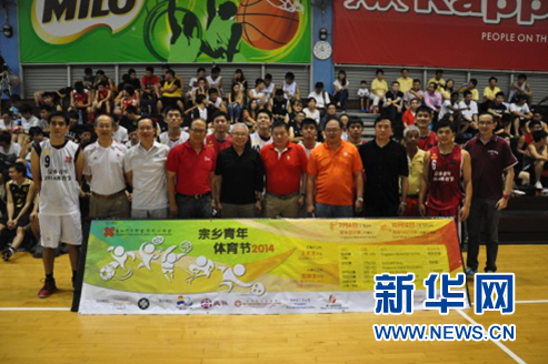 图为2014年宗乡青年体育节开幕式嘉宾合影:新加坡裕廊集选区国会议员王金发(左四)、新加坡宗乡会馆联合总会会长蔡天宝(左五)、新加坡宗乡会馆联合总会秘书长李国基(左三)、新加坡篮球总会总经理林志强(左二)、新加坡宗乡会馆联合总会青年委员会主任白毅柏(右五)、新加坡南安会馆会长陈奕福(右四)及其他会馆代表和新加坡国家篮球队成员等。