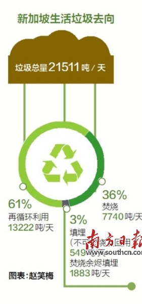 “焚化的一大好处就是可以使垃圾体积大幅减小”,黄华荣为南方日报记者算了一笔账,目前新加坡每天产生的垃圾中,约61%进行再循环利用;而约3%、即550吨左右的垃圾既不可回收,也无法焚烧,因而只能直接填埋;而剩余的36%、即约7700吨,全部通过焚烧处理,而焚烧后的余烬垃圾仅约1800吨。也就是说,虽然新加坡每天产生的垃圾多达21000吨,但最终填埋的量仅约2300吨,大大节约了土地资源。