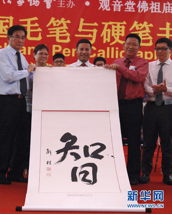 8月31日,新加坡书法家协会会长陈声桂(右二)在新加坡第五届全国毛笔与硬币书法大赛上向主礼嘉宾新加坡国家发展部政务部长李智陞(中)赠送一幅书画作品。新加坡第五届全国毛笔与硬笔书法大赛由新加坡书法家协会主办,吸引了来自新加坡、马来西亚、印度尼西亚以及中国的近6000名书法爱好者参加。记者陈济朋 摄