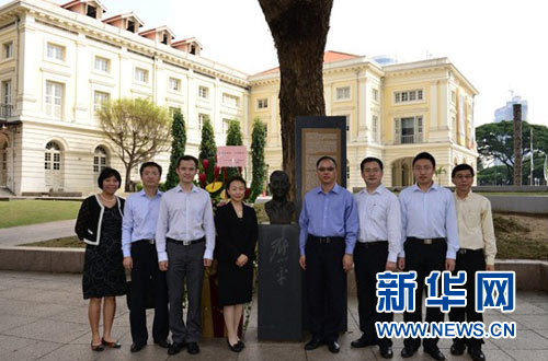 中国驻新加坡大使馆和中国银行代表同邓小平纪念像合影。