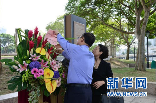 新华网新加坡频道10月2日电(记者金鑫)在庆祝中华人民共和国成立65周年暨邓小平同志诞辰110周年之际,2014年10月1日,中国驻新加坡大使馆翟兴付参赞和中国银行新加坡分行行长郭宁宁来到新加坡河畔,向邓小平纪念像献花,深切缅怀这位为中新两国友谊发展作出巨大贡献的伟人。