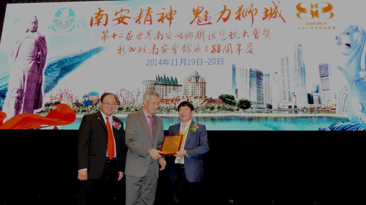 图为明发集团董事局主席黄焕明(右一)接受新加坡总理李显龙(右二)及新加坡南安商会会长陈奕福(左一)颁发捐助证书