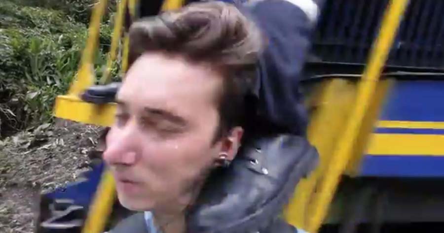图为男子在一列疾驰火车前自拍被列车长踢脸。
