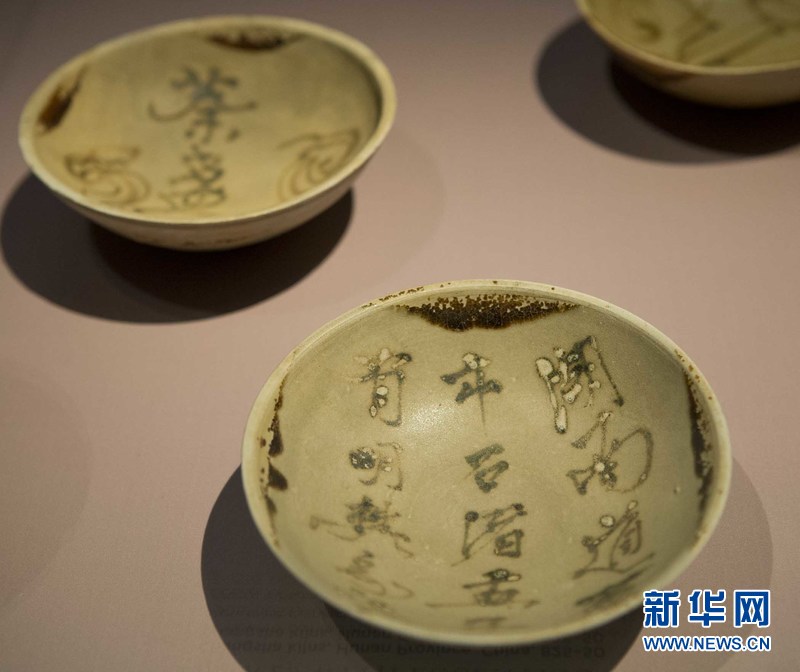 从“黑石号”沉船上打捞起的一只瓷碗,内写有“湖南道草市石诸孟子有明樊家记”字样,有专家认为它应该是那时的广告宣传语。新华网 邹峥摄