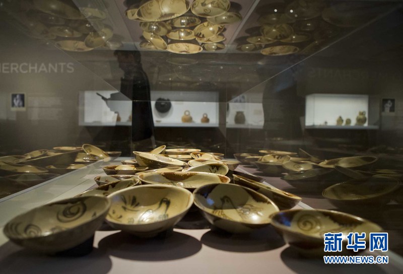 一位参观者从展出的“黑石号”沉船上打捞起的瓷碗旁经过。新华网 邹峥摄