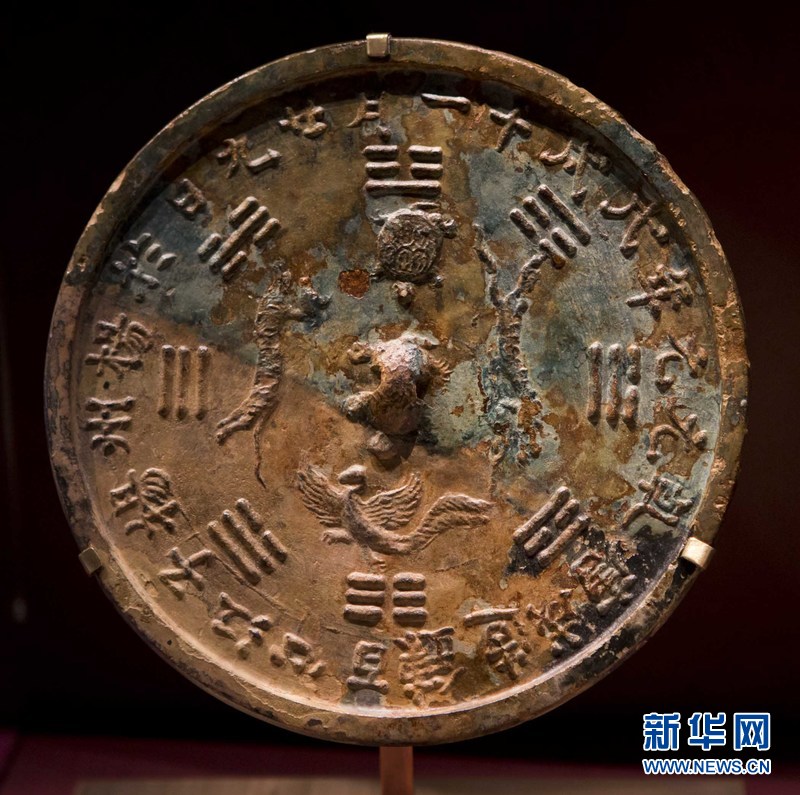 从“黑石号”沉船上打捞起的一面铜镜,带有四神八卦纹饰和铭文,约造于759年,是专贡皇室的“江心镜”。新华网 邹峥摄