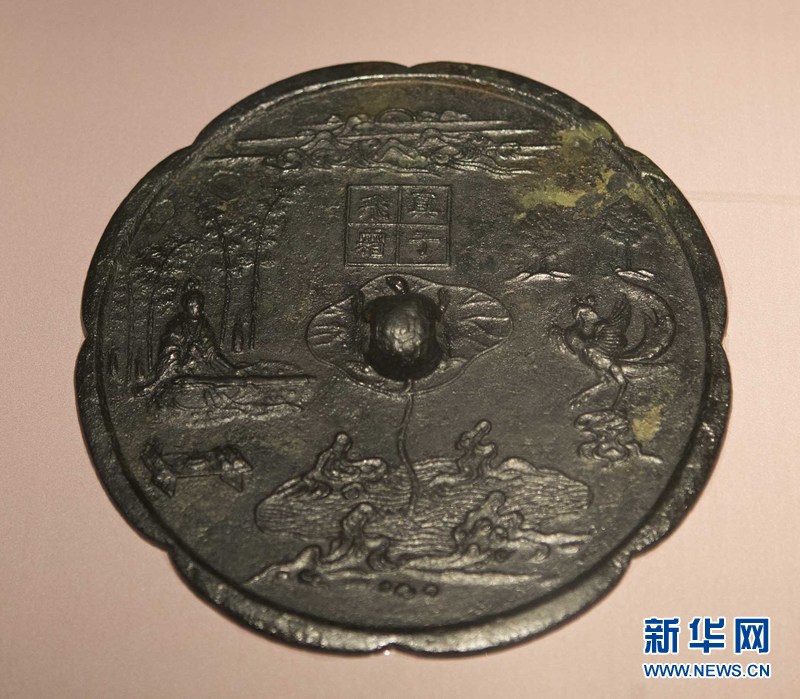 从“黑石号”沉船上打捞起的一面唐代真子飞霜纹铜镜,纹饰内容为俞伯牙弹奏一曲高山流水觅知音的故事。新华网 邹峥摄