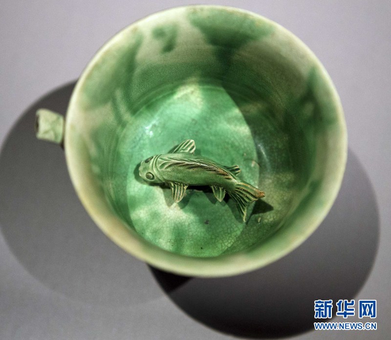 从“黑石号”沉船上打捞起的白釉绿彩鱼底吸杯。新华网 邹峥摄