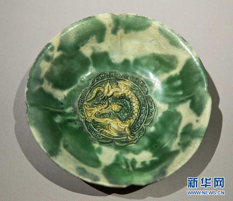 从“黑石号”沉船上打捞起的白釉绿彩龙纹盘。新华网 邹峥摄