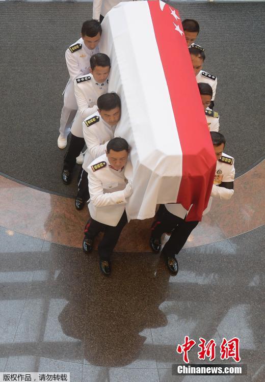 当地时间3月29日,新加坡建国总理李光耀的国葬仪式29日举行,移灵队已从国会大厦出发,前往举行国葬礼的新加坡国立大学文化中心。图为李光耀灵柩抵达新加坡国立大学。