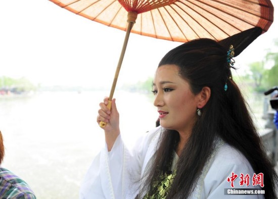 4月18日,“白素贞”现身济南大明湖畔,寻找走进济南非物质文化遗产博览园东方神话世界里的许仙,顿悟爱情真谛的“法海”跟踪而至济南,帮助“白娘子”寻夫归家。中新社发 张勇 摄