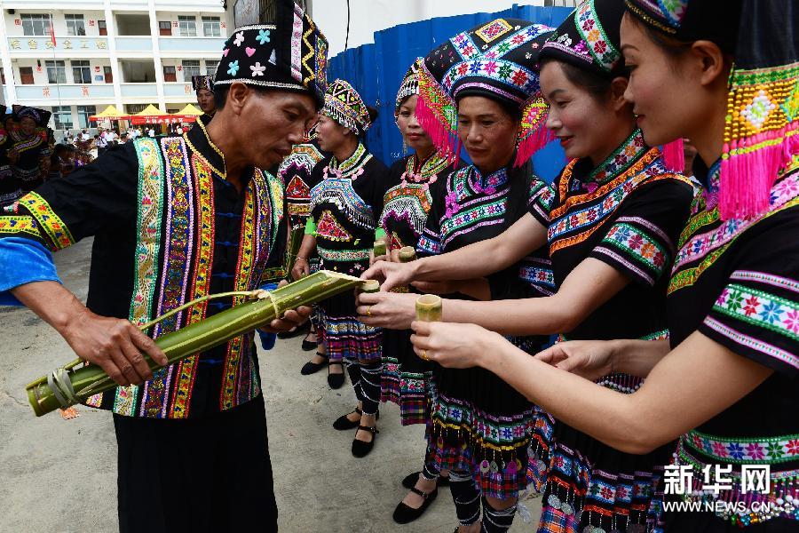 (6)4月21日,在广西百色市右江区阳圩镇达江村,壮族村民斟酒准备迎宾。