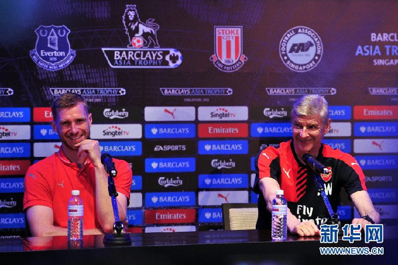 7月14日,阿森纳队教练温格(右)与队长默特萨克出席在新加坡举行的记者会。当日,英超球队阿森纳、埃弗顿、斯托克城和新加坡全明星队出席巴克莱英超亚洲杯在新加坡举行的赛前记者会。新华网发(邓智炜摄)