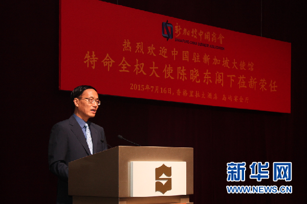 7月16日,中国驻新加坡大使陈晓东在新加坡中国商会欢迎晚宴上致辞