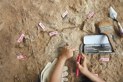工作人员用红色标签标示出发掘到的烧骨烧石。