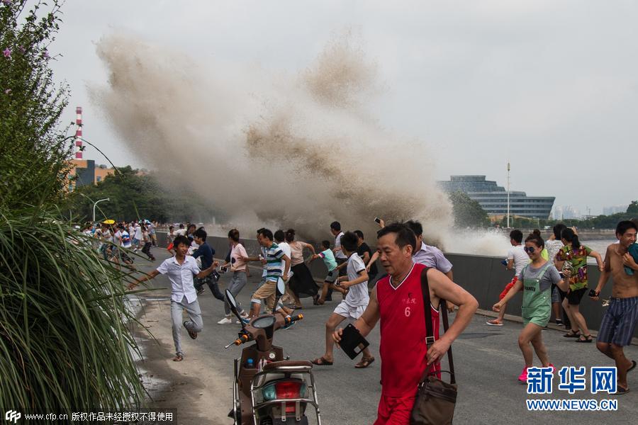 2015年08月16日,杭州,七格村附近汹涌的钱塘江大潮拍岸而起,把一些摄影师和观潮者混身打了“落汤鸡”。 图片来源:cfp