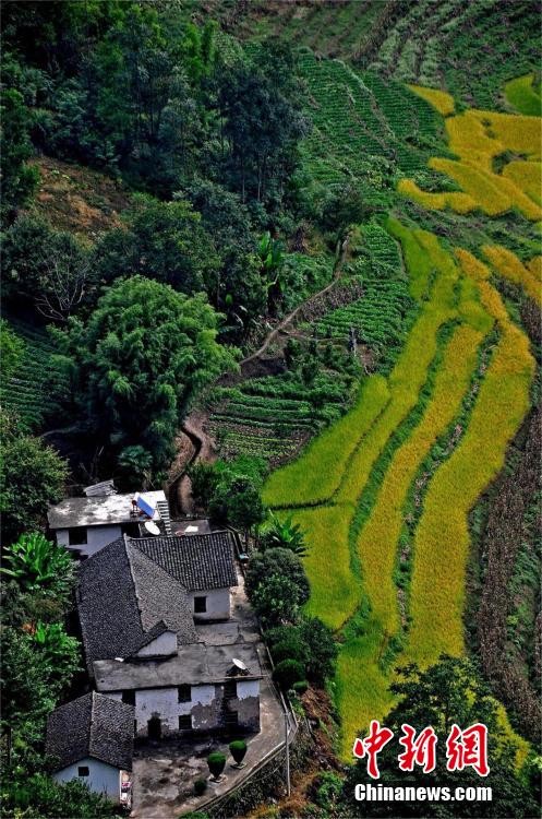 湖北恩施,秋收时节,平均海拔近千米的恩施沙地乡,漫山遍野金黄的水稻梯田环绕在土家吊脚楼中,构成一幅秋日乡村画卷。利用土壤富含硒的优势,今年当地土家村民共种植水稻3000余亩,眼下正值丰收,农民纷纷进田间抢收优质稻。谭华 摄