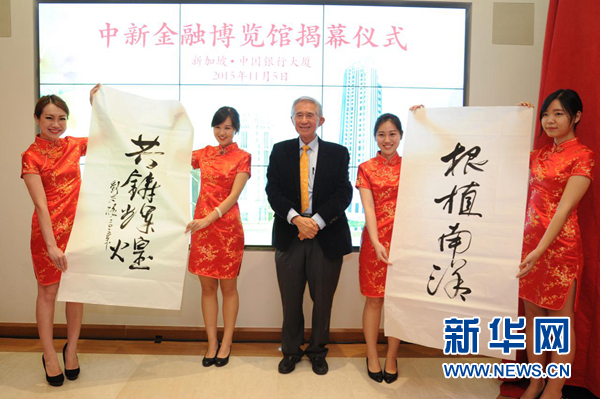 图为“中新金融博览馆”揭幕仪式上,“新加坡规划之父”、新加坡宜居城市研发中心咨询委员会主席刘太格现场题字,庆祝博览馆落成。(王应耀/摄)