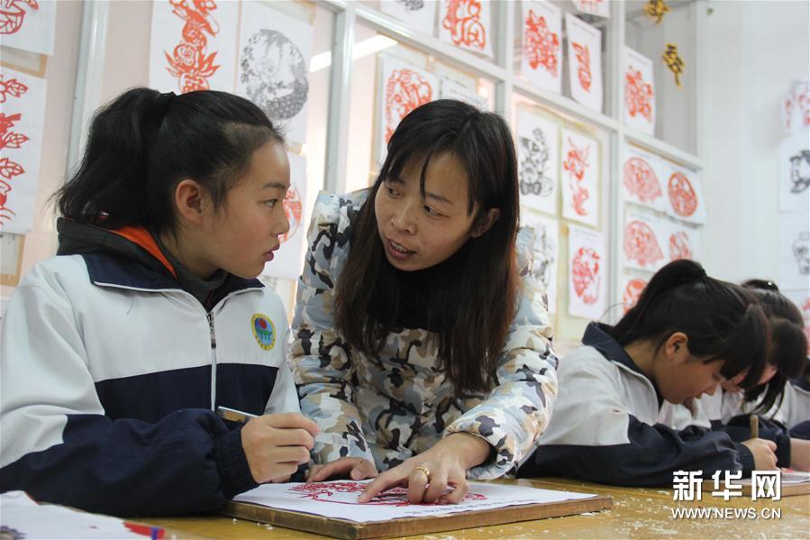 12月7日,河北省临西县第一中学教师在课堂上指导孩子进行剪纸。